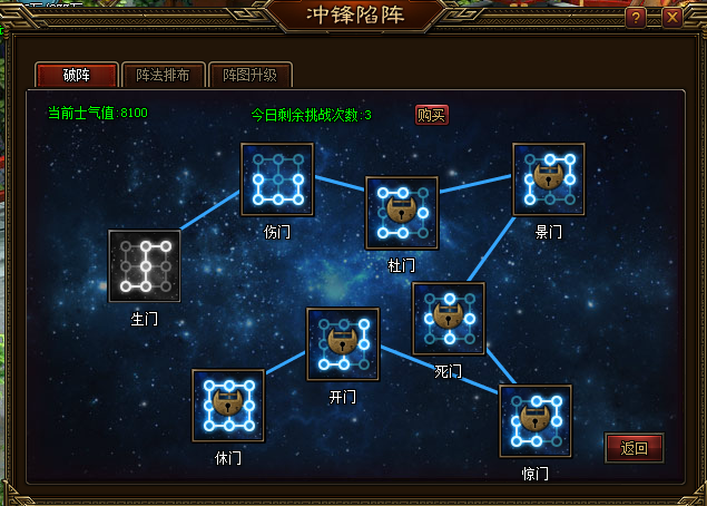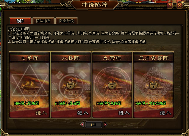 冲锋陷阵分为四个挑战阵,分别为七星阵,八卦阵,九宫阵,三才玄襄阵;