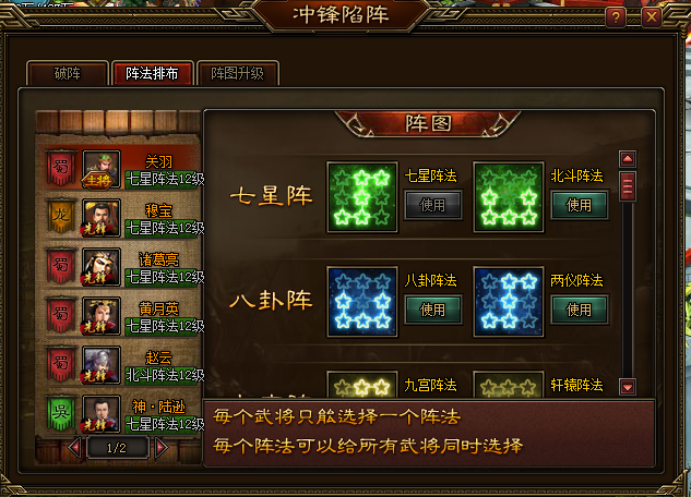 7.每个武将可以选择特定的阵法,但是每个武将只能选择一个阵法,阵法可以同时给不同武将选择。
