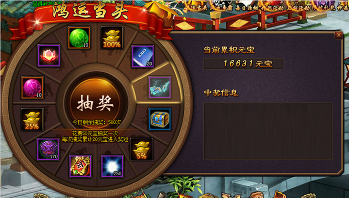 5.当玩家抽中了100%元宝后,奖池中会再次补充5000元宝