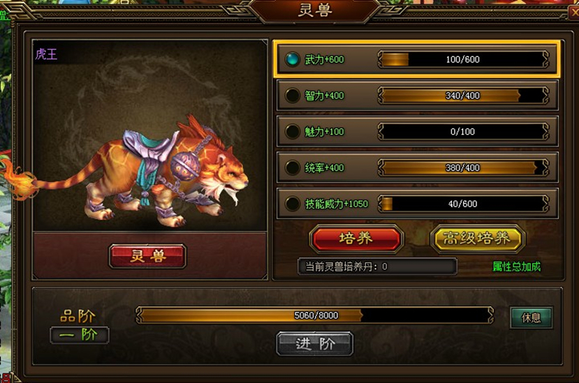 3、灵兽培养:培养能增加灵兽的属性,提高灵兽阶级能提升能培养的属性等级上限。