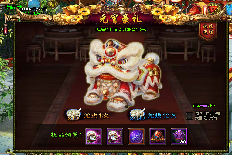 活动内容:通过消耗元宵道具兑换抽奖次数随机抽取各种珍稀道具。